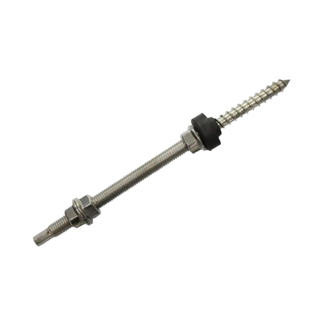 Основным крепежным элементом, соединяющим солнечные батареи с основанием, как при кровельном, так и наземном монтаже является шпилька-шуруп в сборе с гайками и уплотнительной шайбой. Конец такой шпильки с резьбой по дереву, устанавливается в деревянное основание конструкции, или, в случае монтажа в бетонное основание, в предварительно установленный дюбель соответствующего диаметра. На часть шпильки с метрической резьбой, монтируется кронштейн или планка, к которой крепится профиль солнечной панели.
