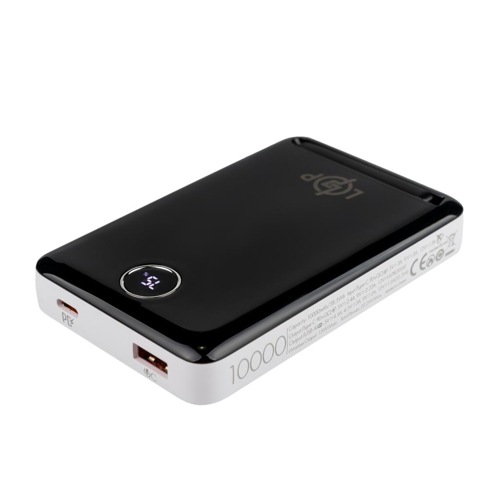 Универсальная мобильная батарея с дисплем для контроля заряда. Встроенный экран позволяет отслеживать уровень заряда аккумулятора, что обеспечивает контроль и позволяет планировать зарядку. Зелёный индикатор на дисплее сигнализирует об активиции беспроводной зарядки.