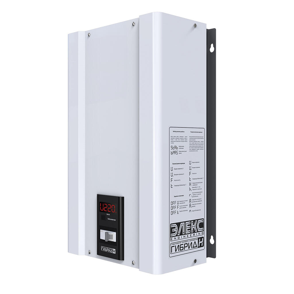 Устанавливать и эксплуатировать стабилизатор Гибрид рекомендуется в сухих и отапливаемых помещениях. Настенную установку рекомендуется производить в вертикальном положении (вентиляторами вверх), оставив сверху и снизу 10-15 см для охлаждения. Подключение осуществляется к существующей проводке через клеммную колодку для аппаратов от 5.5 до 9 кВт и через встроенный шнур с вилкой и розеткой на корпусе стабилизатора для моделей 2.2 и 3.5кВт.